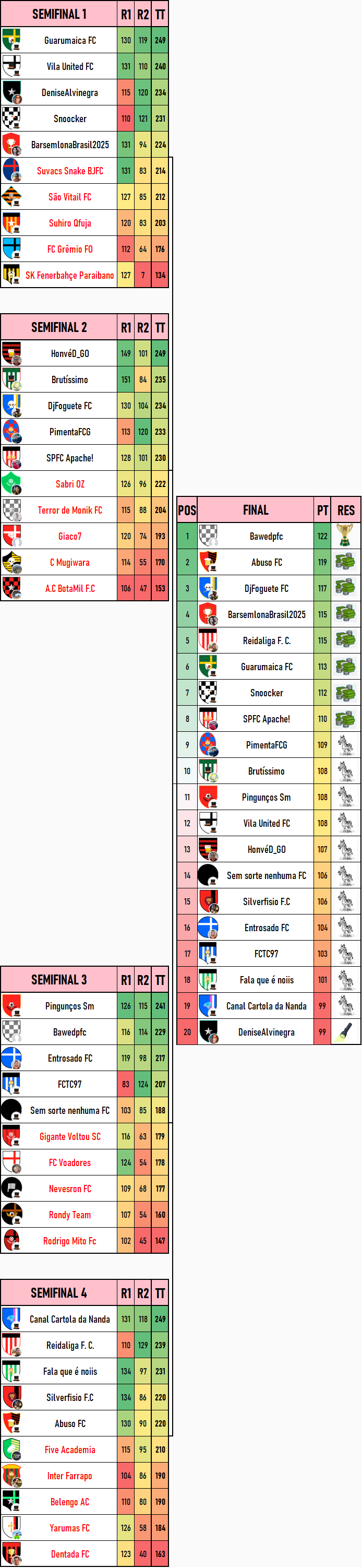 O equilíbrio foi predominante e, consequentemente, as emoções foram fortes do começo ao fim! Ficou com o título o experiente Bawedpfc, que ganratiu a segunda taça de sua história e estava na fila desde 2019 enquanto seguia batendo na trave acumulando premiações em vários torneios das últimas temporadas!