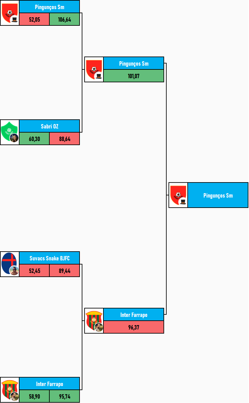 Com 101 pontos marcados, Pingunços superou seu duro oponente e garantiu de maneira espetacular o título da Copa dos Campeões - o primeiro de sua história! Com a conquista, o time eternizou seu escudo na galeria histórica e agora ostenta seu nome ao lado dos melhores times de todos os tempos!